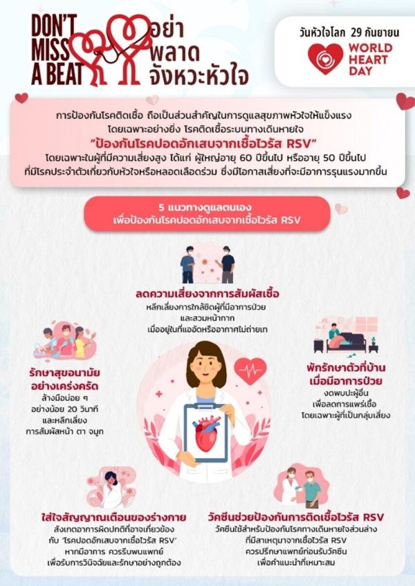 ประเทศไทยพบผู้ป่วยสะสมด้วยโรคหัวใจและหลอดเลือดมากกว่า 2.5 แสนราย และเสียชีวิต ด้วยโรคหัวใจและหลอดเลือดมากถึง 4 หมื่นราย เฉลี่ยชั่วโมงละ 5 คน โดยหนึ่งในผลกระทบที่หลายคนอาจไม่เคยรู้ คือ ผู้ป่วยในจำนวนนี้มีล้วนมีความเสี่ยงต่อการติดเชื้อทางเดินหายใจที่รุนแรงขึ้น เช่น โรคปอดอักเสบจากไวรัสอาร์เอสวี อาร์เอสวีเป็นไวรัสในระบบทางเดินหายใจที่พบได้บ่อยและสามารถป้องกันได้ด้วยวัคซีน อาจก่อให้เกิดอาการที่รุนแรงมากขึ้นในผู้ที่เป็นโรคหัวใจและหลอดเลือด วันหัวใจโลกจึงเป็นการ ตอกย้ำเพื่อสร้างความตระหนักถึงความเสี่ยงและการดูแลสุขภาพเชิงรุกเพื่อปกป้องสุขภาพหัวใจของทุกคนเพื่อให้หัวใจ ไม่พลาดจังหวะ (Don’t Miss a Beat)