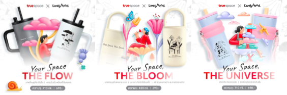 TrueSpace ร่วมกับศิลปิน A.livelyhood เปิดตัวคอลเลกชันพิเศษ “Your Space Collection – Flow | Bloom | Universe” ที่ทุกคนเลือกได้ตามสไตล์ตัวเอง ด้วยดีไซน์ที่มีเสน่ห์เฉพาะตัว เปลี่ยนแก้วเก็บอุณหภูมิให้เป็น “Lifestyle Item” ที่สะท้อนตัวตน โดยได้รับแรงบันดาลใจจาก 3 โลเคชันดังของ TrueSpace: