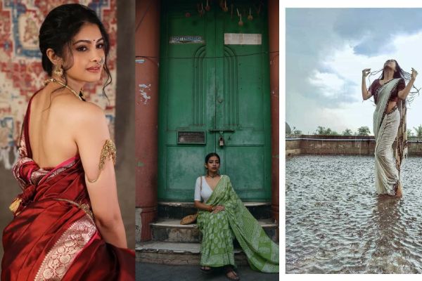 Wedding Wear: Khadi saree with metallic zari borders + statement gold jewelry.