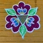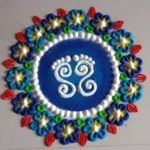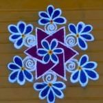 ब्लू, व्हाइट और पर्पल कलर से इस रंगोली डिजाइन को बनाया गया है. इसमें एक चक्र है और 6 फूल बनाए गए हैं. ये डिजाइन भी सुंदर लगेगा और कम समय में बन भी जाएगा . ( Credit : kolam_tamil/Instagram)