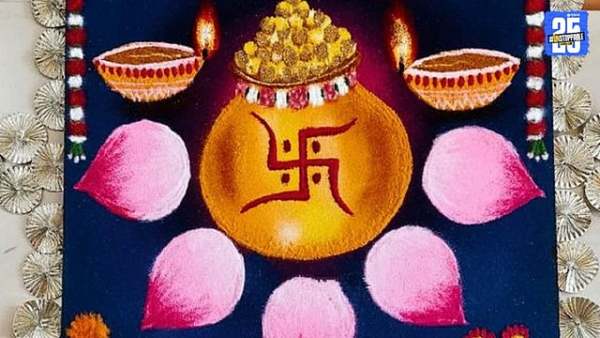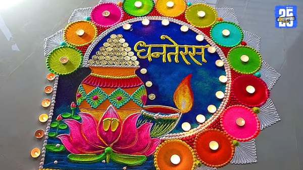 सर्वप्रथम रांगोळी काढण्याआधी पेन्सिलने कमळ, कलश, आणि त्याच्या सभोवती गोलाकार आकृती रेखाटून घ्या. यानंतर तुमच्या आवडीनुसार त्यात विविध रंग भरावे. कलश्याच्या वरती पिवळ्या रंगाने नाण्यांची रचना तयार करा. जी समृद्धीच प्रतीक मानली जाते. कलशच्या बाजूला "धनतेरस" असे सुंदर अक्षरात लिहा, ज्यामुळे रांगोळी अधिक उठून दिसेल.