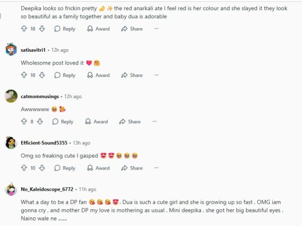One user commented, “Deepika looks so frickin pretty 🤌✨the red anarkali ate I feel red is her colour and she slayed it they look so beautiful as a family together and baby dua is adorable.”