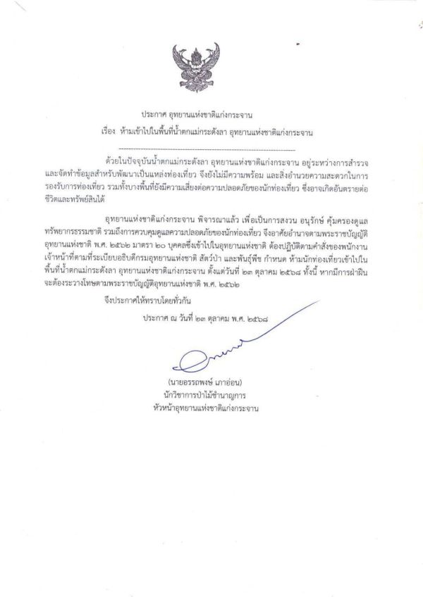 เมื่อวันที่ 23 ตุลาคม อุทยานแห่งชาติแก่งกระจาน ออกประกาศสั่งห้ามบุคคลเข้า พื้นที่น้ำตกแม่กระดังลา หลังเกิดเหตุชายวัย 23 ปี ลื่นล้มได้รับบาดเจ็บ ไม่สามารถขยับตัวได้ โดยการช่วยเหลือเป็นไปด้วยความยากลำบาก เนื่องจากจุดเกิดเหตุไม่มีสัญญาณโทรศัพท์ ถนนเป็นทางลูกรัง และห่างไกลชุมชน