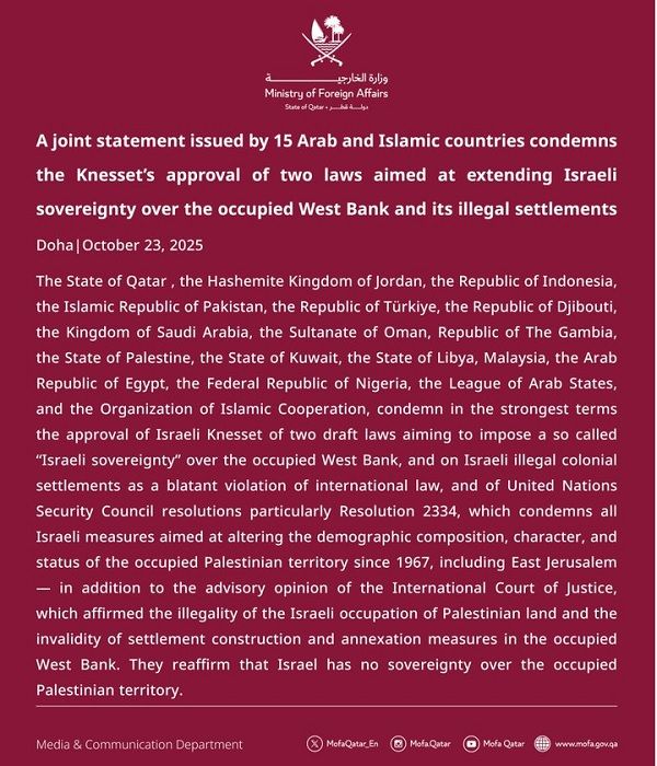 दोहा, 23 अक्टूबर (Udaipur Kiran News) . 15 अरब और इस्लामिक देशों ने इजराइली संसद (कनेसेट) द्वारा वेस्ट बैंक और अवैध बस्तियों पर कब्जा बढ़ाने के दो प्रस्तावित कानूनों को मंजूरी देने की कड़ी निंदा की है. इसमें कतर, जॉर्डन, इंडोनेशिया, पाकिस्तान, तुर्किए, जिबूती, सऊदी अरब, ओमान, गाम्बिया, फिलिस्तीन, कुवैत, लीबिया, मलेशिया, मिस्र, नाइजीरिया, अरब लीग और इस्लामिक सहयोग संगठन शामिल हैं.