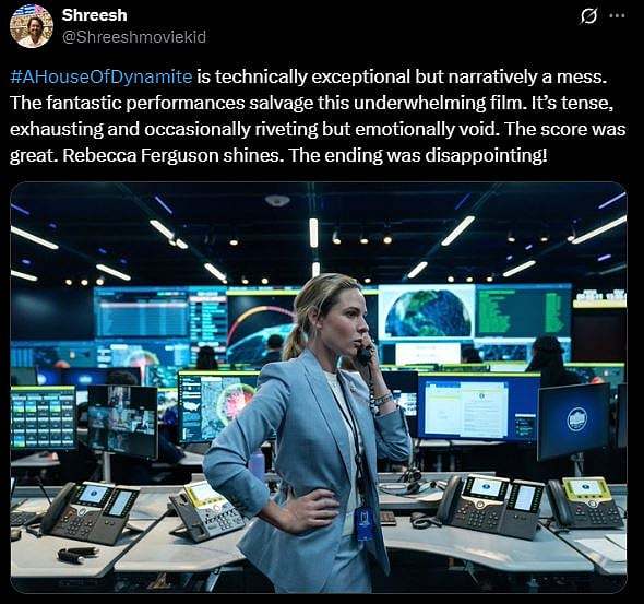 Well, A House of Dynamite has received a mixed response from the netizens. A netizen tweeted, "#AHouseOfDynamite is technically exceptional but narratively a mess. The fantastic performances salvage this underwhelming film. It’s tense, exhausting and occasionally riveting but emotionally void. The score was great. Rebecca Ferguson shines. The ending was disappointing! (sic)."