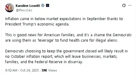 According to a post on X by U.S. Press Secretary, Karoline Leavitt, said it is “likely” that there will be no October inflation report. She added that the lack of data will “leave businesses, markets, families and the Federal Reserve in disarray.”