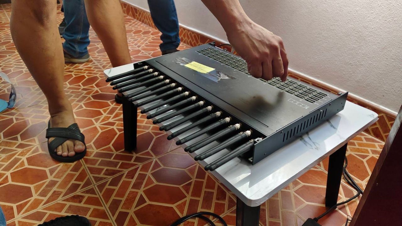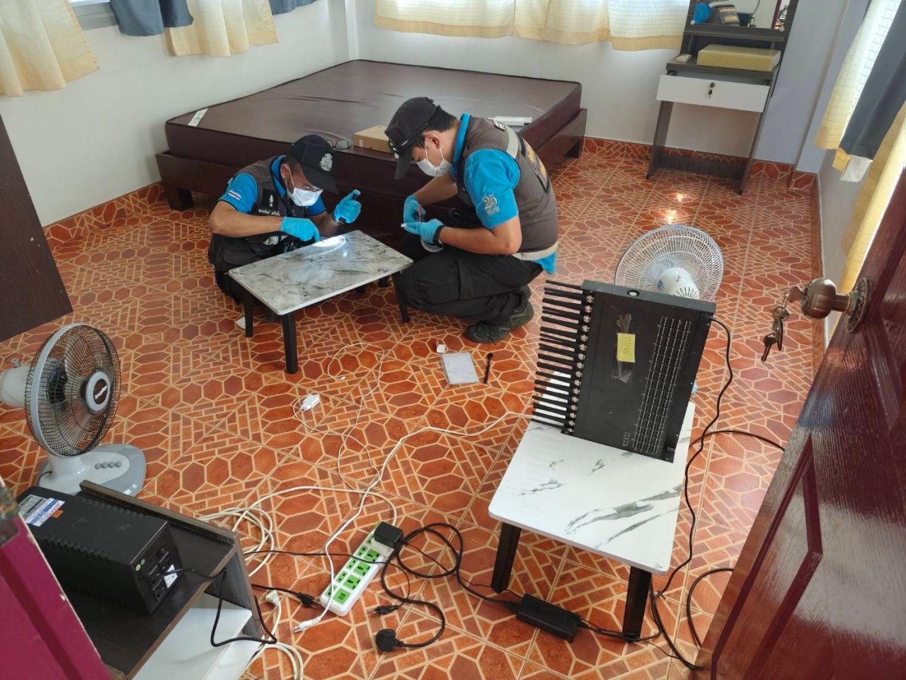 จากการตรวจค้นพบ เครื่องแปลงสัญญาณโทรศัพท์แบบใส่ซิมการ์ด จำนวน 1 เครื่อง (สามารถใส่ซิมการ์ดได้ 128 ช่อง/เครื่อง ) ,โมเด็มต่อสัญญาณอินเทอร์เน็ต จำนวน 1 เครื่อง,กล้องวงจรปิด จำนวน 1 ตัว,เครื่องสำรองไฟ จำนวน 2 ตัว,กล่องใส่โมเด็ม จำนวน 1 กล่อง,พัดลมตั้งพื้น จำนวน 2 ตัวและโต๊ะพับญี่ปุ่นขนาดเล็ก จำนวน 2 ตัว แต่ไม่พบผู้เช่า