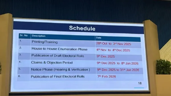 SIR के दूसरे चरण के लिए बीएलओ और एईआरओ की ट्रेनिंग प्रक्रिया कल यानी मंगलवार 28 अक्टूबर से शुरू हो जाएगी। 3 नवंबर 2025 प्रिंटिग और ट्रेनिंग क की प्रक्रिया चलेगी। चुनाव विभाग ने सभी राजनीतिक पार्टियों से बूथ लेवल एजेंट्स की नियुक्ति जल्द से जल्द करने की अपील की है। इससे बाद 4 नवंबर से 4 दिसंबर 2025 तक बीएलओ घर-घर जाकर मतदाताओं की जानकारी जुटाएंगे। इसके बाद 9 दिसंबर 2025 को मतदाता सूची का ड्राफ्ट पेश किया जाएगा। जबकि 7 फरवरी 2026 को फाइनल मतदाता सूची का प्रकाशन होगा।
