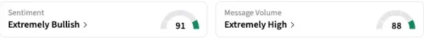Following the results, retail remained ‘extremely bullish’ about Palantir stock as of late Monday, with sentiment rising a few notches higher within the zone, and the message volume turned ‘extremely high.’ Retail chatter over the 24 hours leading up to late Monday spiked 4,425%.