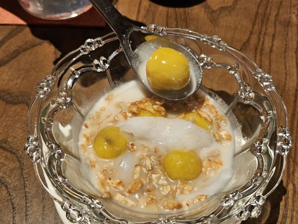 ซึ่งเมนูเรียกน้ำย่อยจานแรกที่เราได้ชิมคือ “ขนมครก พร้าวเผ็ด พร้าวหวาน” เมนูที่แปลกใหม่แต่คุ้นเคย ขนมครกครึ่งหนึ่งหอมมันจากพร้าวหวาน ส่วนอีกครึ่งแฝงรสเผ็ดซ่อนเปรี้ยวจากพร้าวเผ็ด เมื่อรับประทานพร้อมกัน รสชาติทั้งสองฝั่งกลับประสานกันอย่างลงตัว