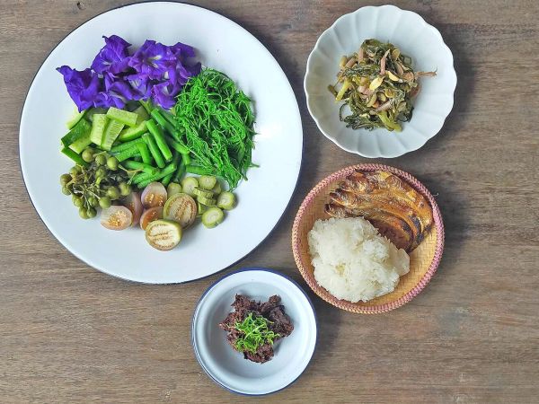 หนังสือบอกให้กินกับข้าวเหนียว ปลาปิ้ง ชิ้นปิ้ง ผักกาดส้ม (ผักกาดดอง) แล้วก็ผักลวกครับ ผมเลยจัดเท่าที่พอมีมาเข้าสำรับ อนึ่ง แจ่วบองแขวงเชียงขวางขนานนี้ไม่ปรุงรสเปรี้ยวใดๆ นอกจากหน่อไม้ส้ม การกินกับผักดองแบบบ้านๆ หรือยอดผักรสเปรี้ยวจัดจึงน่าจะครบรสพอดี ผมกินไปก็จำได้ว่า นี่เป็นรสชาติที่เคยกินเมื่อเกือบสามสิบปีที่แล้วแน่ๆ กลิ่นและรสที่มีฤทธิ์ชาลิ้นหน่อยๆ นั้นทำให้เกิดความอยากอาหารเพิ่มขึ้นจริงๆ