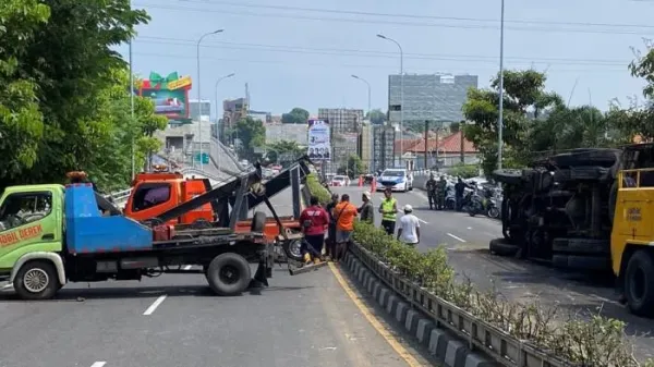 Di lokasi kejadian, truk tampak terguling di jalur menuju arah Gombel.