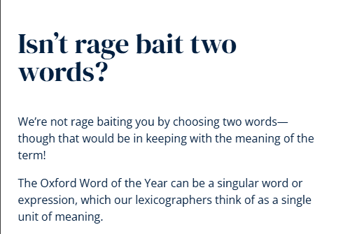 “The emergence of rage bait as a standalone term highlights both the flexibility of English language, where two established words can be combined to give a more specific meaning in a particular context – in this case, online – and come together to create a term that speaks to the world today,” OUP said in a statement.