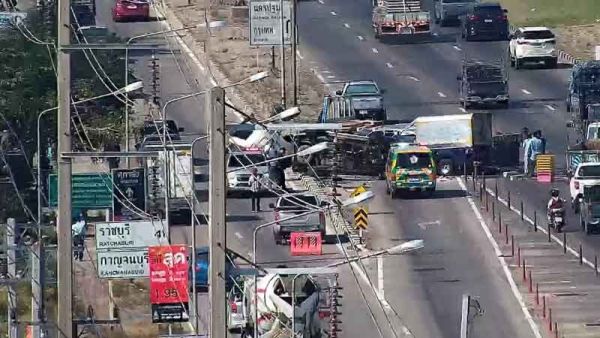 รถพ่วง พุ่งข้ามเลน ชนกระบะเลนสวน 3 คัน พังยับ ชายวัย59-ร.ต.อ.วัย59 เสียชีวิตสลด ในที่เกิดเหตุยังพบผู้บาดเจ็บอีก 2 ราย เสาไฟฟ้าหักโค่น