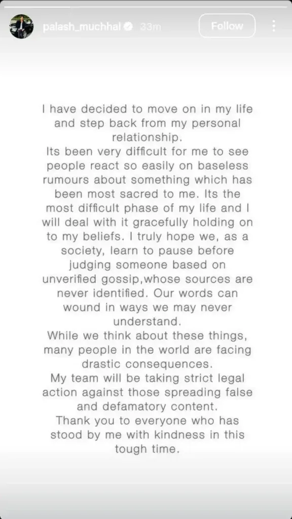 Sharing a note on Instagram, Palash wrote, “I have decided to move on in my life and step back from my personal relationship. Its been very difficult for me to see people react so easily on baseless rumours about something which has been most sacred to me. Its the most difficult phase of my life and I will deal with it gracefully holding on to my beliefs.”