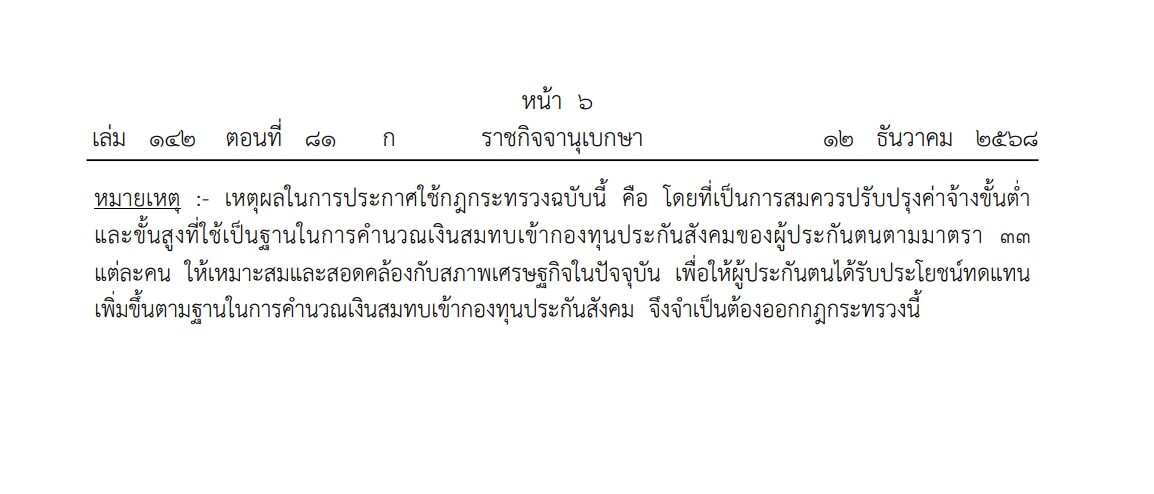 วันที่ 14 ธ.ค.2568 ผู้สื่อข่าวรายงานว่า เว็บไซต์ ราชกิจจานุเบกษา ได้เผยแพร่กฎกระทรวง กำหนดค่าจ้างขั้นต่ำและขั้นสูงที่ใช้เป็นฐานในการคำนวณเงินสมทบของผู้ประกันตนตนตามมาตรา 33 พ.ศ.2568