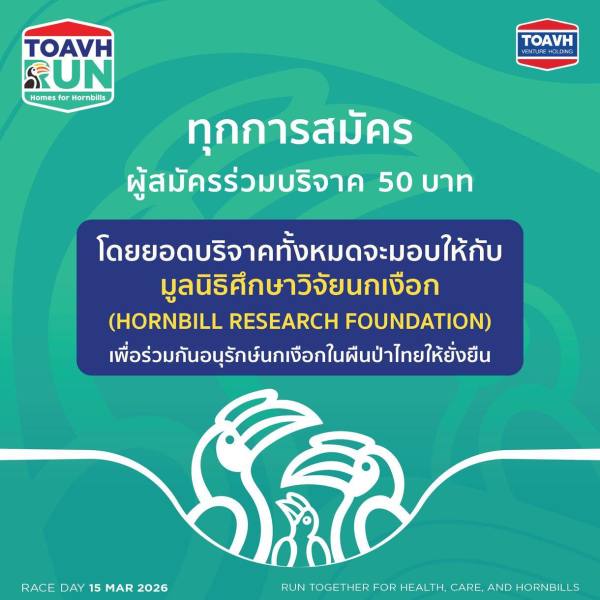 TOAVH เชิญชวนร่วมงานวิ่งการกุศล “TOAVH RUN X Homes of Hornbills” วันอาทิตย์ที่ 15 มีนาคม 2569 ณ สวนหลวง ร.9 เดินหน้าระดมทุนสร้างโพรงรังเทียมให้นกเงือก ในโครงการ Homes for Hornbills เปิดรับสมัครแล้ววันนี้!