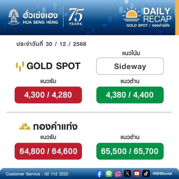 ทางด้าน ฮั่วเซ่งเฮง วิเคราะห์แนวโน้มราคาทองคำ (เช้า) ประจำวันที่ 30 ธันวาคม 2568 ทองโลกมีการปรับตัวลง จากการที่ดัชนีเงินดอลลาร์ (DXY) ยังคงทรงตัวในระดับ 98.0 หน่วย