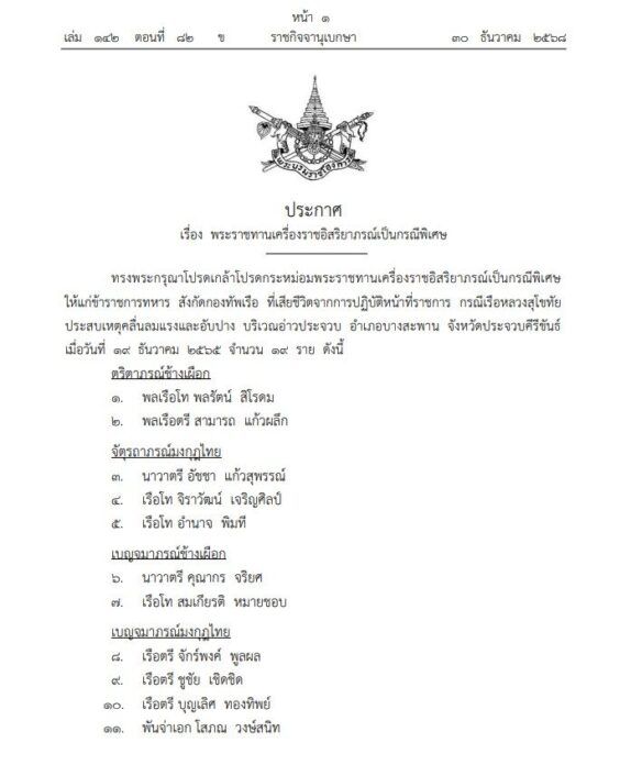 ราชกิจจานุเบกษา เผยแพร่พระบรมราชโองการ โปรดเกล้าฯ พระราชทานเครื่องราชอิสริยาภรณ์เป็นกรณีพิเศษ แก่ 19 ทหารเรือ เสียชีวิตจากเหตุ เรือหลวงสุโขทัย อัปปาง