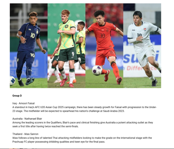 ด้าน สมาพันธ์ฟุตบอลแห่งเอเชีย (เอเอฟซี) เลือกนักเตะเด่นในแต่ละทีม ของศึก 23 ปีเอเชีย โดยในกลุ่ม D สำหรับทีมชาติไทย เอเอฟซี ชี้ไปที่ อิคลาส สันหรน จากพีที ประจวบ เอฟซี ที่เดินตามรอยมิดฟิลด์ตัวรุกชาวไทย ที่หวังแจ้งเกิดในเวทีนานาชาติ มีจุดเด่นด้านการเลี้ยงบอล และสายตาเฉียบคมในการจ่ายบอลจังหวะสุดท้าย