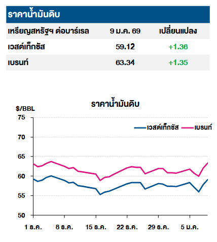 โดยราคาน้ำมันดิบเวสต์เทกซัสซื้อขายเมื่อ 9 ม.ค. 2569 อยู่ที่ 59.12 เหรียญสหรัฐต่อบาร์เรล เพิ่มขึ้น +1.36 เหรียญสหรัฐ และราคาน้ำมันดิบเบรนต์อยู่ที่ 63.34 เหรียญสหรัฐต่อบาร์เรล เพิ่มขึ้น +1.35 เหรียญสหรัฐต่อบาร์เรล