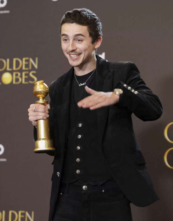 Timothee Chalamet celebrates his win for Best Performance by a Male Actor in a Motion Picture – Musical or Comedy for "Marty Supreme" at the 83rd Annual Golden Globes in Beverly Hills, California, U.S., January 11, 2026.