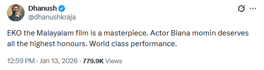 Tamil star Dhanush wrote, “EKO the Malayalam film is a masterpiece. Actor Biana Momin deserves all the highest honours. World class performance.” His words made fans of the film very happy. Many viewers shared the post and spoke about the film again. The praise from Dhanush has given the film fresh attention across languages.