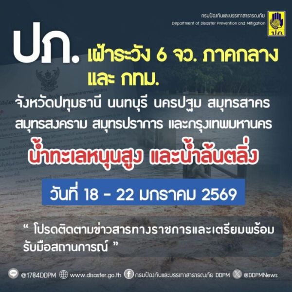 กรมป้องกันและบรรเทาสาธารณภัย แจ้งเตือน 6 จังหวัดภาคกลาง และกรุงเทพมหานคร เฝ้าระวังและติดตามสถานการณ์น้ำทะเลหนุนสูง ช่วง 18-22 ม.ค.