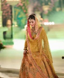 For the Mehndi ceremony, Maryam Nawaz chose a radiant mustard-yellow lehenga choli designed by celebrated Pakistani designer Nomi Ansari. The outfit was intricately adorned with traditional gota work, showcasing fine craftsmanship and festive charm. The statement dupatta, finished with detailed hand embellishments and a bold border, was draped gracefully, adding sophistication to her overall appearance. Fashion critics applauded her choice for balancing vibrancy with elegance.
