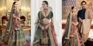 Shanzeh wore an exquisite emerald green and multi-coloured lehenga by legendary Indian designer Sabyasachi Mukherjee. The multi-panelled lehenga was lavishly embellished with zardozi, dabka, gota patti, and shimmering sequins. A soft tea-pink net dupatta draped elegantly over one shoulder added a romantic touch to the ensemble.