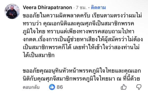 โดยระบุว่า ขออภัยในความผิดพลาด และเรียนตามตรงว่าไม่ทราบมาก่อนว่า คุณเอกนิติ และศุภจีเป็นสมาชิกพรรคภูมิใจไทย โดยทราบเพียงทางพรรคภูมิใจไทยไปสอบถามยังคณะกรรมการการเลือกตั้ง (กกต.) เรื่องการเป็นผู้ช่วยหาเสียงให้ผู้สมัคร ซึ่งได้รับคำตอบว่าไม่จำเป็นต้องเป็นสมาชิกพรรค จึงทำให้เข้าใจว่าสองท่านดังกล่าวไม่ได้เป็นสมาชิกพรรค