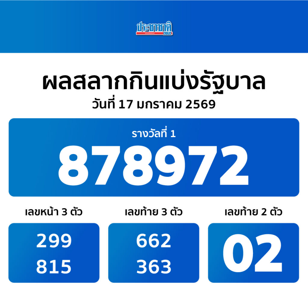 ตรวจหวยวันนี้ (17 ม.ค. 69) ผลสลากกินแบ่งรัฐบาล หวย ตรวจผลรางวัล ใบตรวจหวย 17 ม.ค. สำหรับการออกรางวัลงวดวันที่ 17 ม.ค. 69 นี้ สำนักงานสลากกินแบ่งรัฐบาลทำการออกรางวัล ณ อาคารออกรางวัล สนง.สลากกินแบ่งฯ สนามบินน้ำ อ.เมือง จ. นนทบุรี ตรวจเช็กทุกผลรางวัลกับ “ประชาชาติธุรกิจออนไลน์” ที่นี่ (อัพเดตล่าสุดพร้อมใบตรวจหวย)
