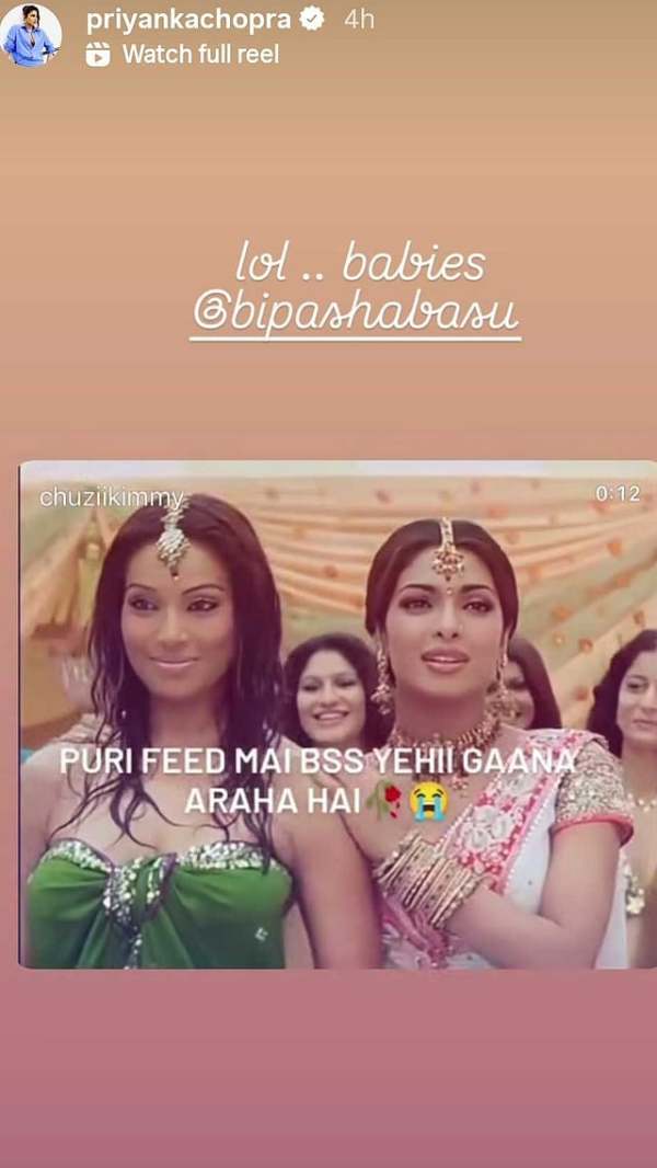 Priyanka shared a reel on her Instagram story, which states, "Puri feed mei bas yahi gaana aaraha hai." The actress on her story tagged Bipasha and wrote, "lol.. babies (sic)."