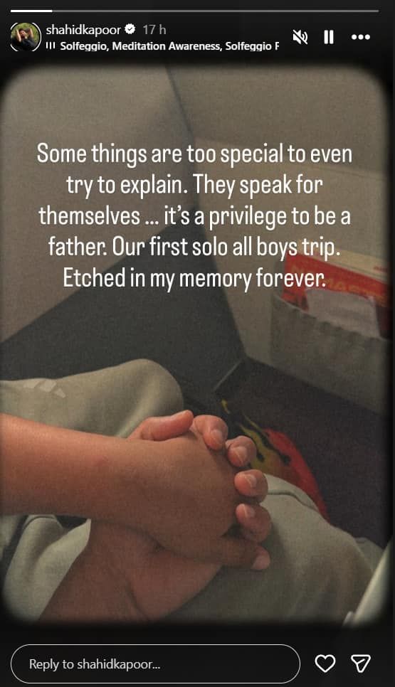 हाल ही में शाहिद कपूर ने इंस्टाग्राम पर अपने बेटे जैन के साथ पहली सोलो बॉयज ट्रिप की एक तस्वीर शेयर की. तस्वीर में शाहिद अपने बेटे का हाथ पकड़े नज़र आ रहे हैं, जो पिता-बेटे के बीच के प्यार भरे पल को दिखाती है. तस्वीर के साथ उन्होंने लिखा, 'कुछ बातें इतनी खास होती हैं कि उन्हें शब्दों में समझाया नहीं जा सकता. वे खुद ही सब कुछ कह देती हैं. पिता होना मेरे लिए सौभाग्य है. बेटे के साथ हमारी पहली सोलो बॉयज़ ट्रिप. यह याद हमेशा मेरे दिल में रहेगी.'