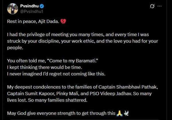 पी.व्ही. सिंधूने तिच्या ट्विटरवरुन अजित पवारांच्या निधनासंदर्भात शोक व्यक्त केला असून दादांच्या बारामती भेटीचं माझं स्वप्न अपूर्ण राहिल्याचंही म्हटलं आहे. तुम्हाला अनेकवेळा भेटण्याचे भाग्य मला लाभले. या भेटीत प्रत्येकवेळी तुमची शिस्त, तुमची कार्यपद्धती आणि तुमचे आपल्या लोकांप्रती असलेले प्रेम पाहून मी थक्क व्हायचे. तुम्ही मला नेहमी म्हणायचा, "माझ्या बारामतीला नक्की या.. "मला वाटायचं की, जाऊ या कधीतरी अजून खूप वेळ आहे, आपण निवांत जाऊ. मात्र, असं काही घडेल आणि मला बारामतीला न जाण्याचा असा पश्चात्ताप करावा लागेल, याचा विचारही मी कधी केला नव्हता, अशी प्रतिक्रिया पी.व्ही सिंधून व्यक्त केली. तसेच, अपघातातील मृतांप्रती सहवेदना व्यक्त करत सिंधूने श्रद्धांजली अर्पण केली.