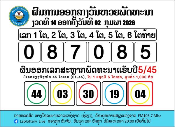 สรุปผลการออกรางวัลสลากกินแบ่งรัฐบาล สปป.ลาว หรือ หวยพัฒนา ภายใต้การกำกับของกระทรวงการเงิน งวดล่าสุดวันที่ 2 กุมภาพันธ์ 2569 ผลรางวัลทั้งหมดมีดังนี้: