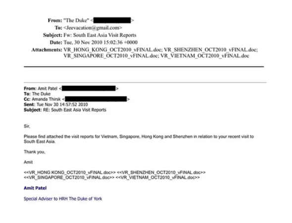 The documents include emails sent on October 7, 2010, in which Andrew allegedly informed Epstein of upcoming trips to Singapore, Vietnam, Shenzhen in China and Hong Kong, the BBC reported.