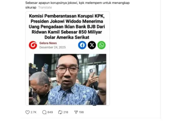 Unggahan tersebut juga disertai judul artikel “Komisi Pemberantasan Korupsi KPK, Presiden Jokowi Widodo Menerima Uang Pengadaan Iklan Bank BJB dari Ridwan Kamil Sebesar 850 Miliyar Dolar Amerika Serikat,” serta narasi tambahan yang menyudutkan KPK.