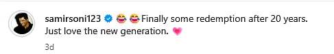Reacting to the video, Samir re-shared it on Instagram and wrote, “Finally, some redemption after 20 years. Just love the new generation.”
