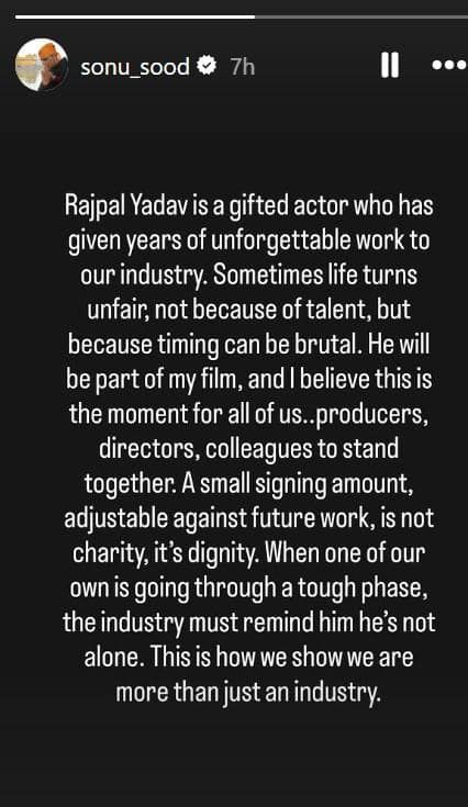 सोनू सूद ने लिखा- राजपाल यादव गिफ्टेड एक्टर हैं. उन्होंने सभी को खूब हंसाया और सालों तक ऐसा काम किया जिसे भुलाया नहीं जा सकता. जिंदगी कभी सख्त और अनफेयर हो जाती है. ये टैलेंट की वजह से नहीं बुरे वक्त की वजह से होता है. राजपाल यादव मेरी फिल्म में होंगे. मुझे लगता है कि सभी को उनकी मदद के लिए आगे आना चाहिए. काम के बदले छोटा साइनिंग अमाउंट दान नहीं है. ये सम्मान है.