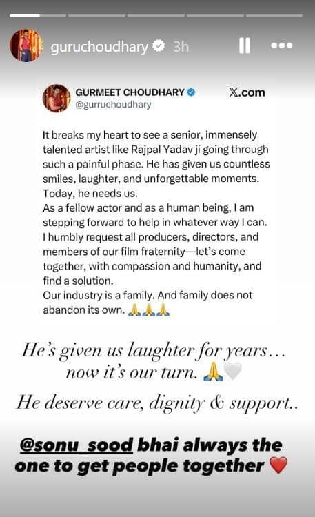 गुरमीत चौधरी ने लिखा, 'ये देखकर दिल टूट जाता है, जब राजपाल यादव जैसे सीनियर और टैलेंटेड आर्टिस्ट इतने दर्दभरे फेज से गुजरते हैं. उन्होंने हमें बहुत हंसाया है और कई न भूलने वाले पल दिए हैं. आज उन्हें हमारी जरुरत है. एक्टर और इंसान होने के नाते मैं जो भी कर सकता हूं उनकी मदद करूंगा. मैं सभी प्रोड्यूसर्स, डायरेक्टर्स और फिल्म इंडस्ट्री के मेंबर्स से रिक्वेस्ट करता हूं वो भी मदद को आगे आएं और इसका हल ढूंढ़े. हमारी इंडस्ट्री एक फैमिली है. परिवार अपनों को अकेला नहीं छोड़ती है. उन्होंने हमें सालों हंसाया अब हमारी बारी है. वो केयर, सम्मान और सपोर्ट डिजर्व करते हैं. सोनू सूद भाई वो पहले शख्स होते हैं जो लोगों को साथ लाते हैं.'