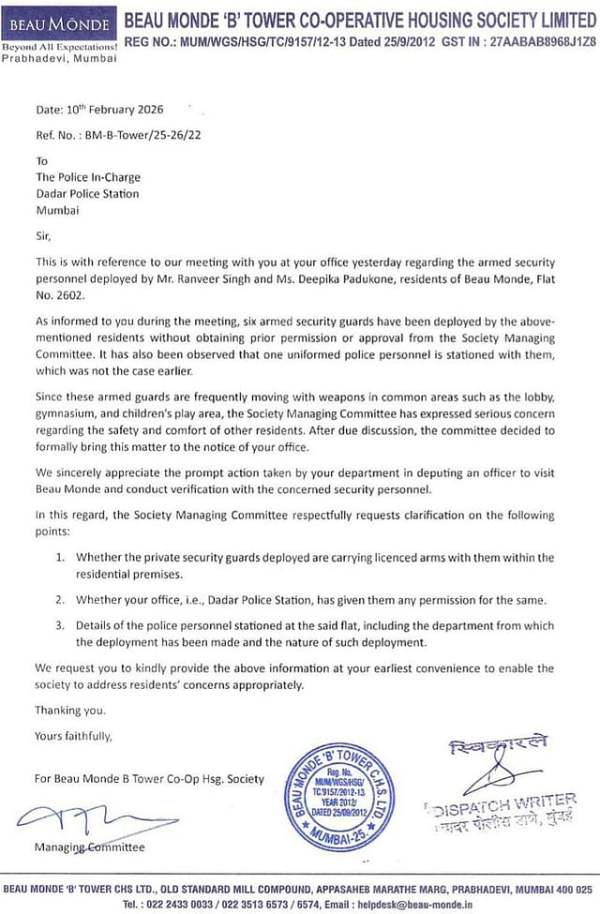 The society has submitted a formal letter to Dadar Police Station, stating that the armed guards were deployed without prior permission or approval from the Society Managing Committee. Beau Monde Housing Society’s letter sent to Dadar Police has been accessed by FPJ.