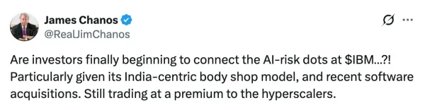 “Are investors finally beginning to connect the AI-risk dots at $IBM…?!” Chanos posted, flagging the company’s “India-centric body shop model” and recent software acquisitions. He added that the company is still trading at a premium to other hyperscalers.