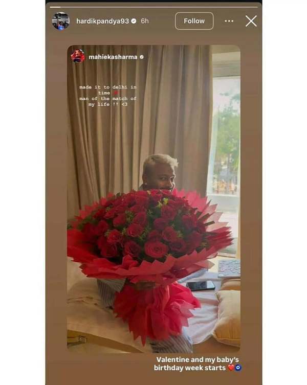 Adding to the buzz, Sharma recently posted a photo of Pandya holding a bouquet of roses, captioning it, “Made it to Delhi in time. Man of the match of my life!!” Pandya reshared the post, writing, “Valentine and my baby’s birthday week starts.”