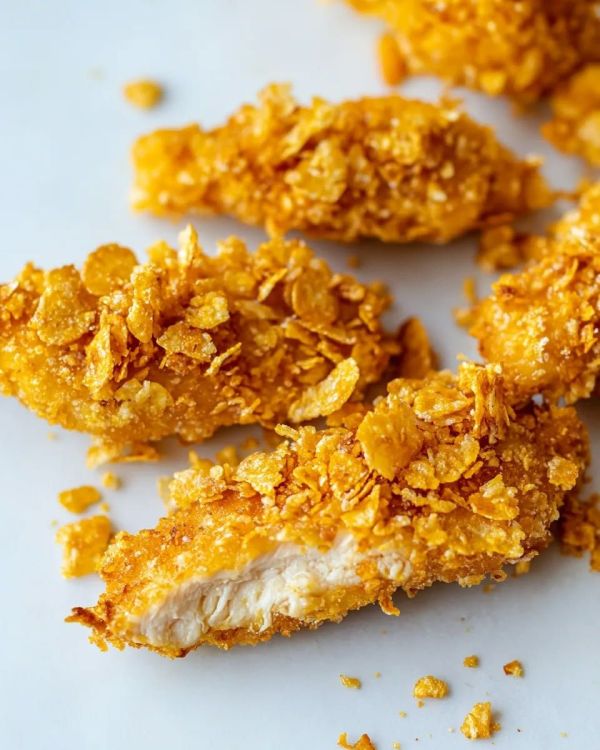 Ayam dilapisi cornflakes yang bikin teksturnya ekstra kriuk di luar tapi tetap juicy di dalam.