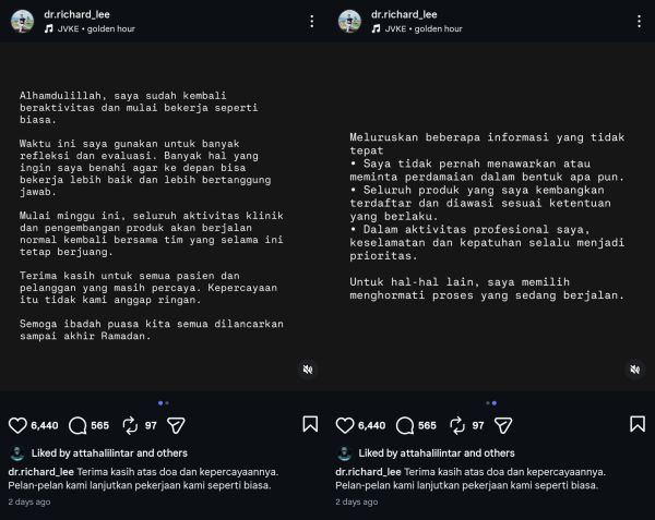 "Banyak hal yang ingin saya benahi agar ke depan bisa bekerja lebih baik dan lebih bertanggung jawab. Mulai minggu ini, seluruh aktivitas klinik dan pengembangan produk akan berjalan normal kembali bersama tim yang selama ini tetap berjuang," tulis Richard.