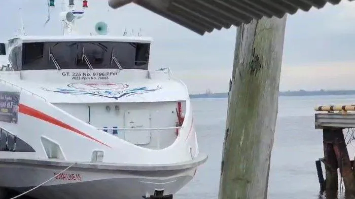 Di atas jembatan, kapal-kapal tampak bersandar secara berjarak di bagian pinggir Sungai Batang Arau.