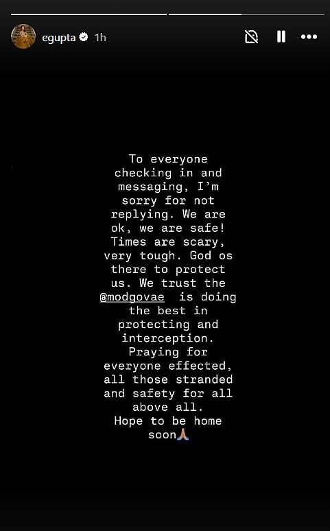 Her post comes at a time when several Indian celebrities are believed to be in the UAE. Actress Sonal Chauhan, known for her film Jannat, and badminton champion PV Sindhu are among those stuck in the region amid the ongoing security situation.