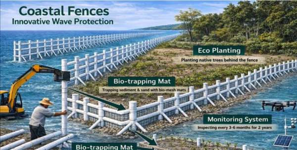 “ ไม้ไผ่เทียมชะลอคลื่นและรั้วดักตะกอนจากวัสดุพลาสติกย่อยสลายได้ทางชีวภาพ ออกแบบทนทานคลื่นลมและสภาพแวดล้อมทางทะเล ลดการผุกร่อนบริเวณรอยต่อดินเลนและน้ำทะเล อายุใช้งานยาวนานกว่าโครงสร้างวัสดุไม้ไผ่ธรรมชาติ เมื่อหมดอายุใช้งานย่อยสลายกลับสู่ธรรมชาติ แนวรั้วชะลอคลื่นนี้ลดพลังงานคลื่น เอื้อต่อการสะสมตะกอนเลนหลังแนวป้องกัน เหมาะฟื้นฟูและปลูกป่าชายเลน นวัตกรรมนี้ผสมผสานระบบติดตามประเมินผลการฟื้นตัวระบบนิเวศและชายฝั่ง ทช.นำนวัตกรรมและการจัดการเชิงพื้นที่เพื่อแก้ปัญหาอย่างเป็นระบบ “
