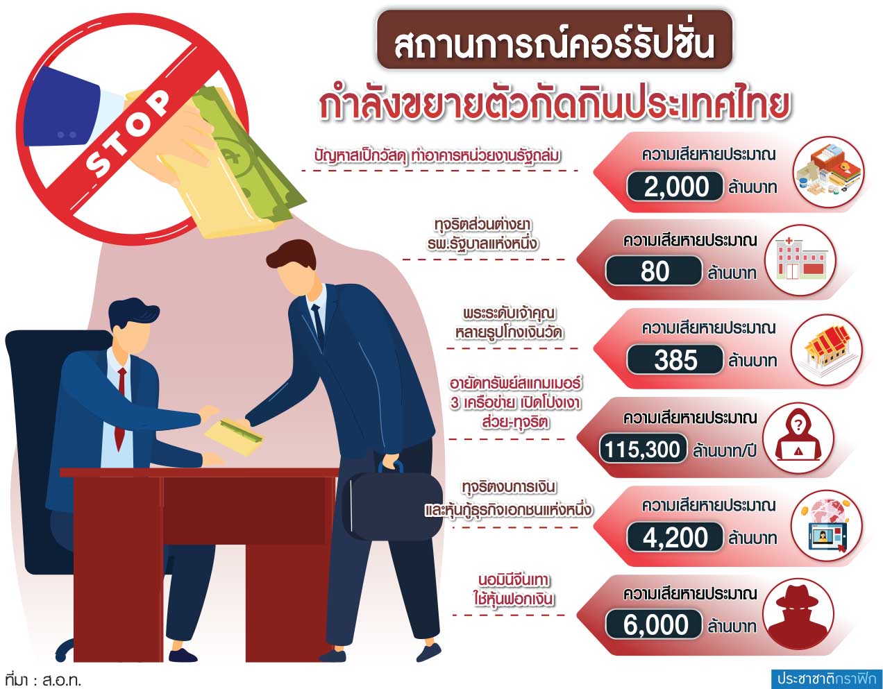 2.ฉ้อราษฎร์ : สินบนและส่วยจากเศรษฐกิจนอกระบบ ประเมินว่าธุรกิจมืดเหล่านี้มีมูลค่า 8-13% ของ GDP หรือราว 1.7 ล้านล้านบาทต่อปี หรือคิดเป็นการจ่ายส่วยสินบนให้เจ้าหน้าที่ทุกระดับจากต้นทางถึงปลายทางแค่ 5% จะเป็นเงินมากถึง 8.5 หมื่นล้านบาทต่อปี 3.กัดกินกันเอง : เป็นสินบนและค่าวิ่งเต้นในหมู่เจ้าหน้าที่ของรัฐด้วยกันเอง ส่วนใหญ่มักเป็นการซื้อขายตำแหน่ง 4.ค่าใช้จ่ายในการป้องกันและปราบปรามคอร์รัปชั่นของรัฐ : จากข้อมูลพบว่าในปี 2566 หน่วยงานทั้ง ป.ป.ช., ป.ป.ท. และ สตง. ใช้งบประมาณ 5,848 ล้านบาท และมีบุคลากรรวมกันกว่า 7,578 คน นอกจากนี้ ยังไม่รวมการทุจริตเชิงนโยบาย หรือการใช้ช่องว่างทางกฎหมายในการทุจริตคอร์รัปชั่น สถานการณ์คอร์รัปชั่นกำลังขยายตัวอย่างน่ากลัว